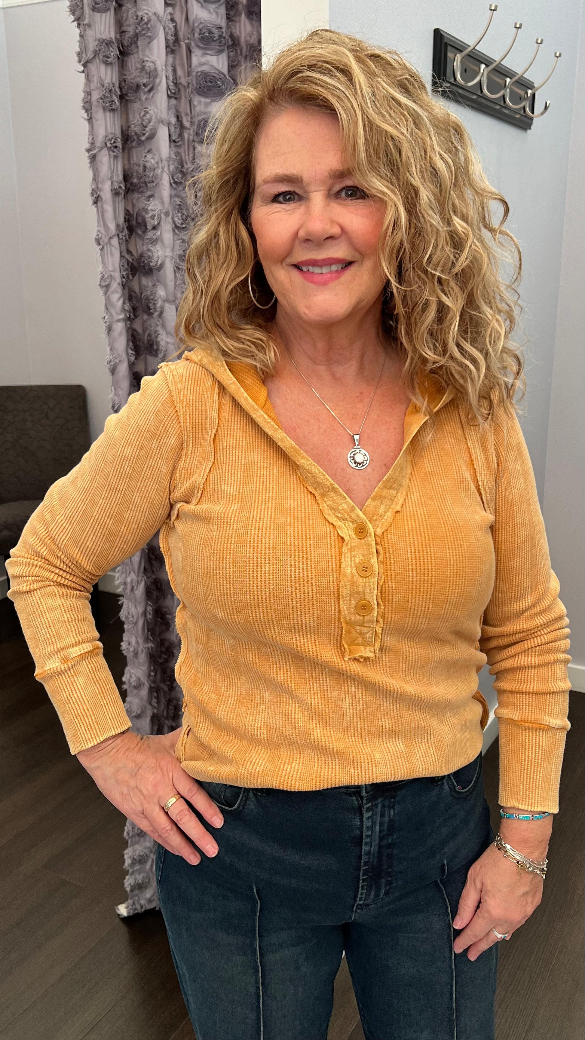 Say hello to your new “golden hour” favorite — this honey-hued waffle knit henley was born for cozy weekends, coffee runs, and lazy-day lounging that still looks cute. With its soft texture, raw edge details, and easy button neckline, it’s that effortlessly undone look we all secretly try to master.