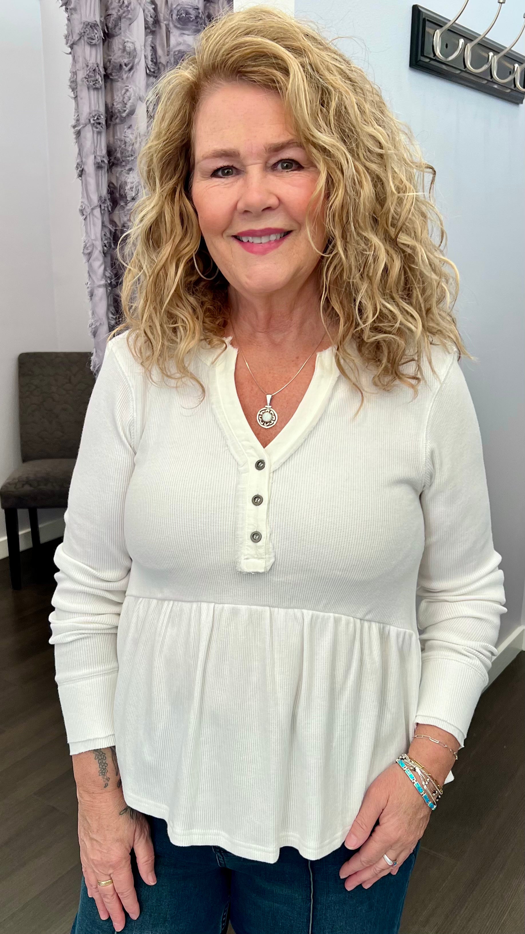 Softly ribbed with a dreamy drape, this top takes your basic white tee and gives it a glow-up. The peplum hem flatters every shape (hello, waist definition!) while the button neckline adds that casual-chic touch you can dress up or down.