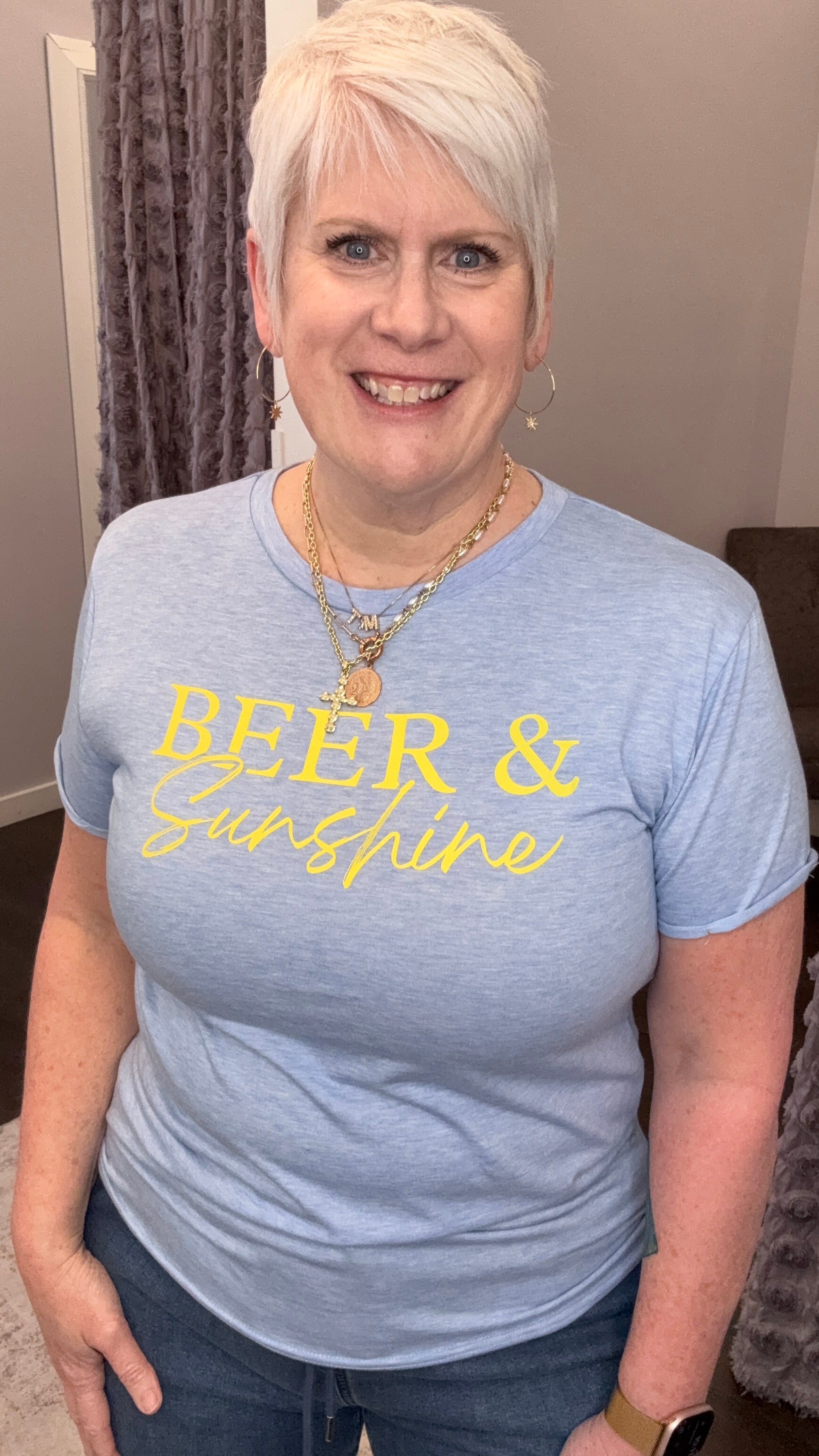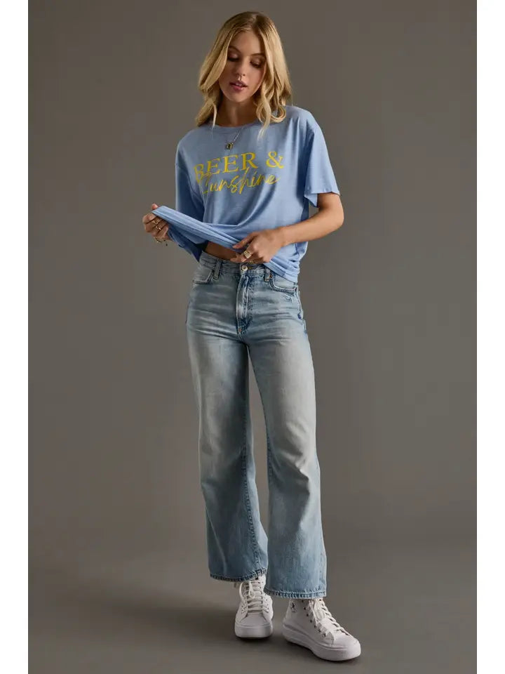 This light blue Beer & Sunshine graphic tee features sunny yellow lettering, a classic crew neck, and an easy relaxed fit that’s made for front-tucks and laid-back days.