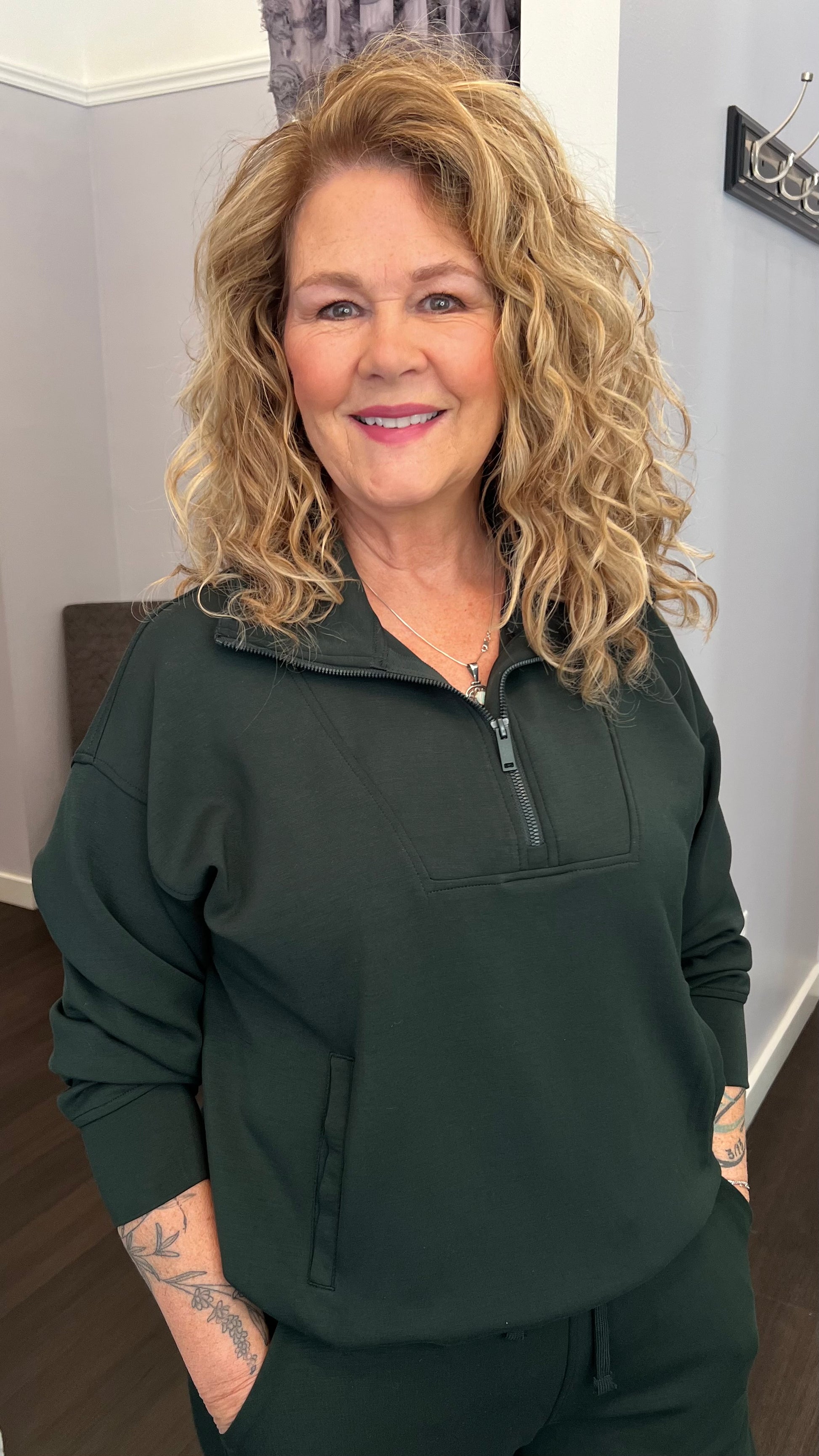 This funnel-neck half-zip is made from ultra-smooth modal scuba, so it feels silky on the outside and soft and cozy on the inside—without being heavy or bulky. The clean lines, hidden half zip, and structured funnel neck give it a polished, modern vibe, while the relaxed fit keeps it perfectly comfy for real life (school runs, office days, hockey bleachers and couch time all count).