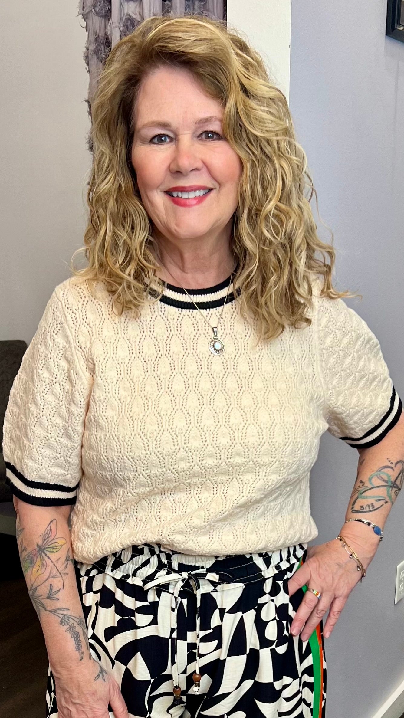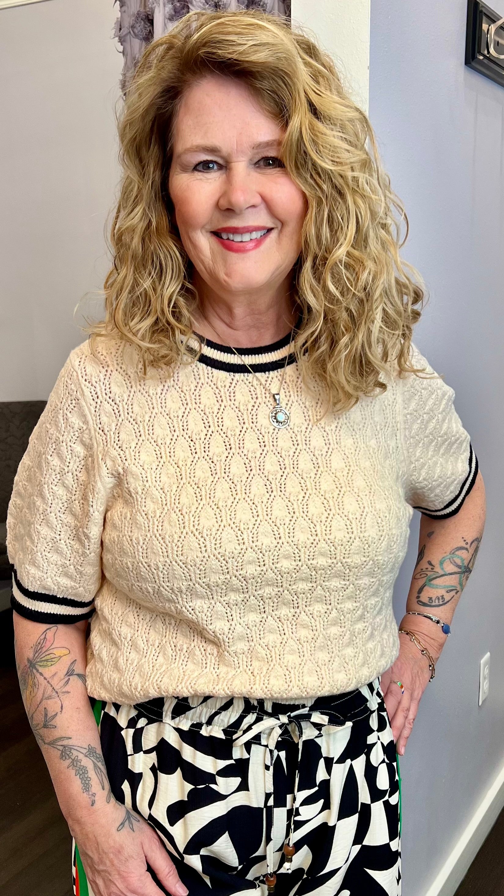 Meet your “looks polished, feels easy” knit. This THML sweater tee comes in a soft ivory with a pretty textured diamond knit, finished with black + ivory striped ribbed trim at the neckline, sleeves, and hem for a classic, preppy pop (without trying too hard 😉).