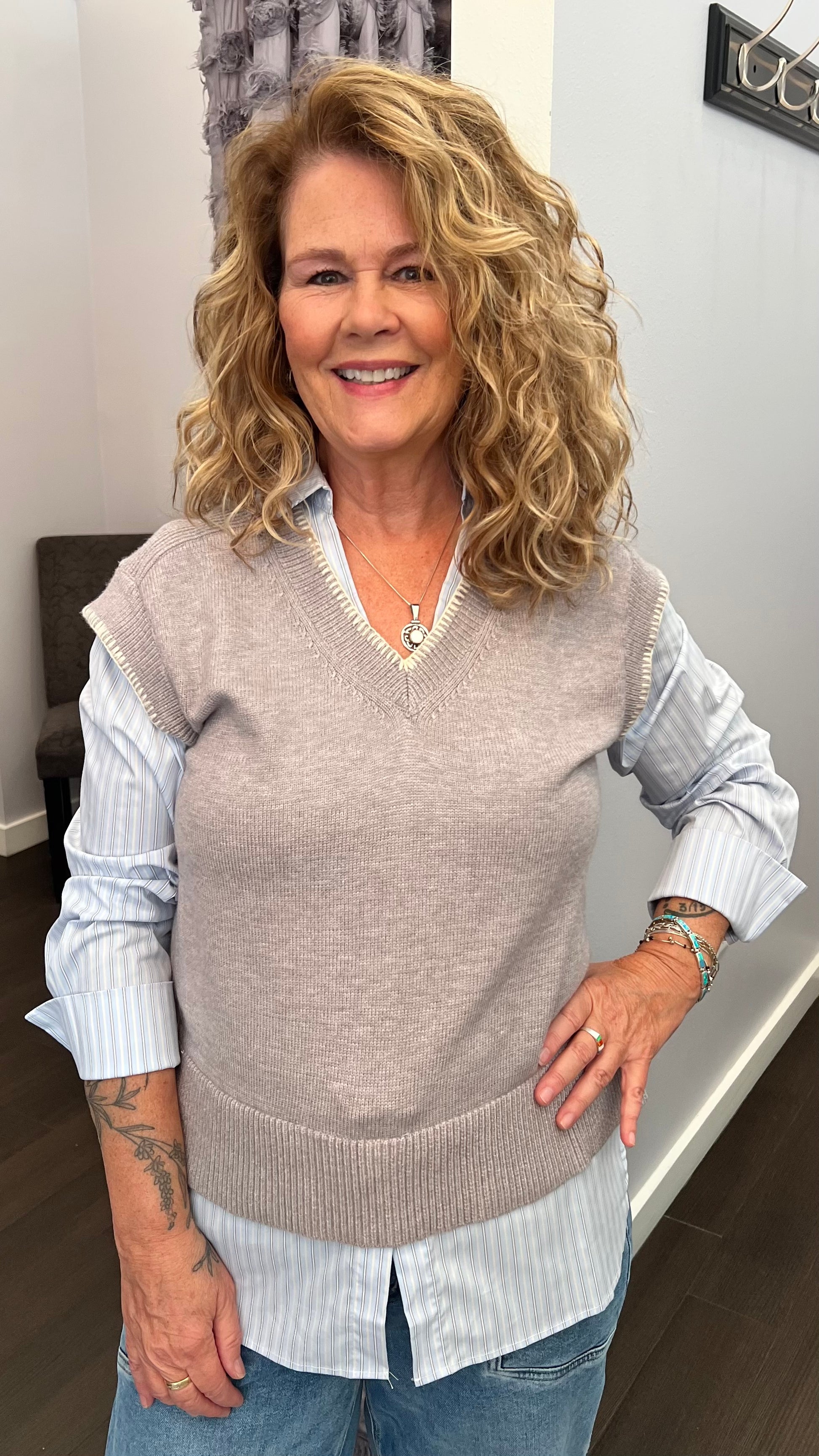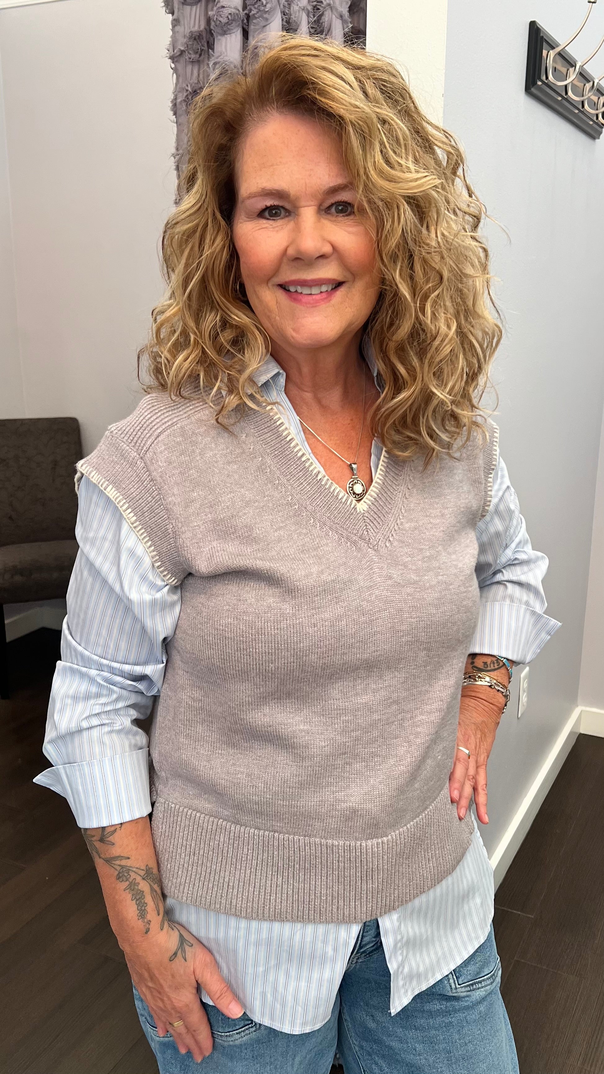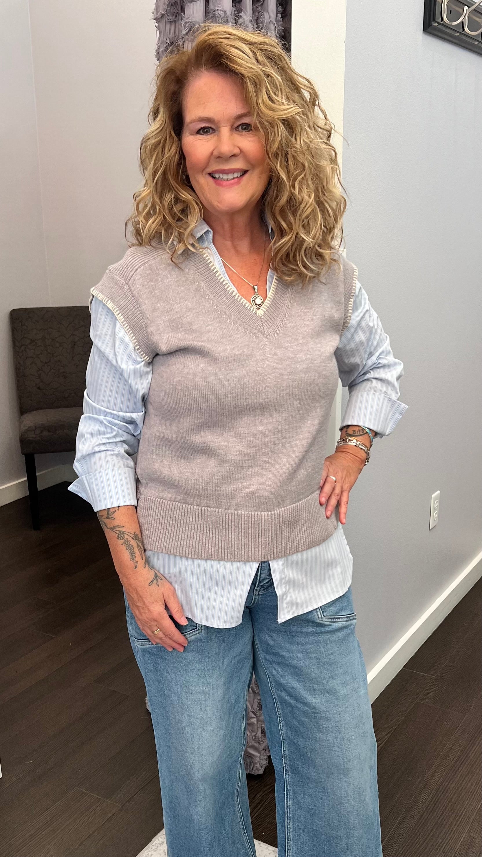 This little number is giving "I studied abroad and still made it to brunch on time.” A crisp, pinstriped button-up meets a soft dove-gray sweater vest — perfectly pre-layered so you can look effortlessly put-together without actually trying (because we love a shortcut to classy).
