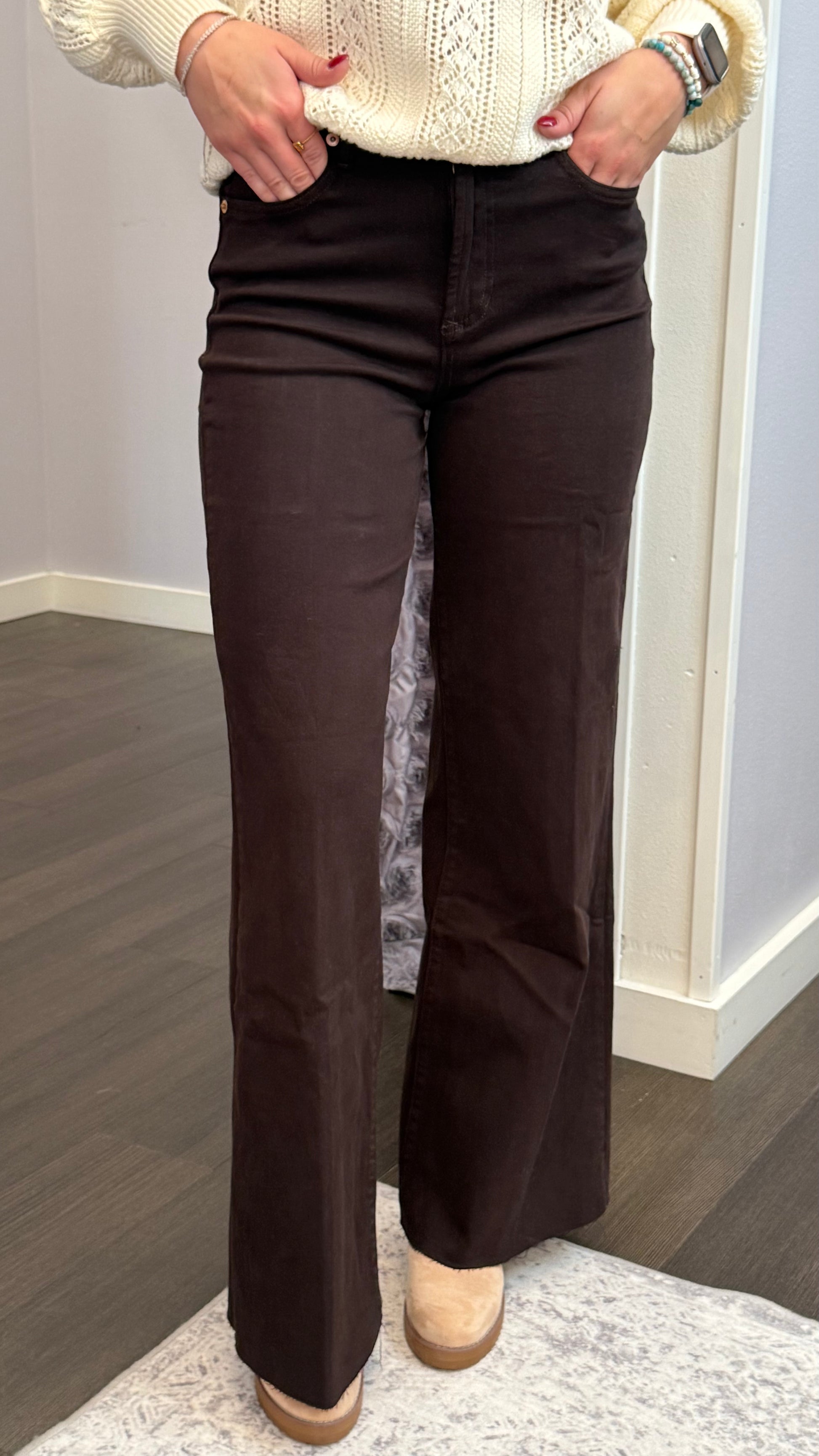 This high-rise jean hugs you in all the right places before flowing into a clean, ankle-skimming hem with that perfectly raw edge (just a hint of rebellion). The deep Chocolate Torte shade brings an elevated richness that’s just as tempting as dessert — chic enough for dinner dates, cozy enough for casual Fridays.