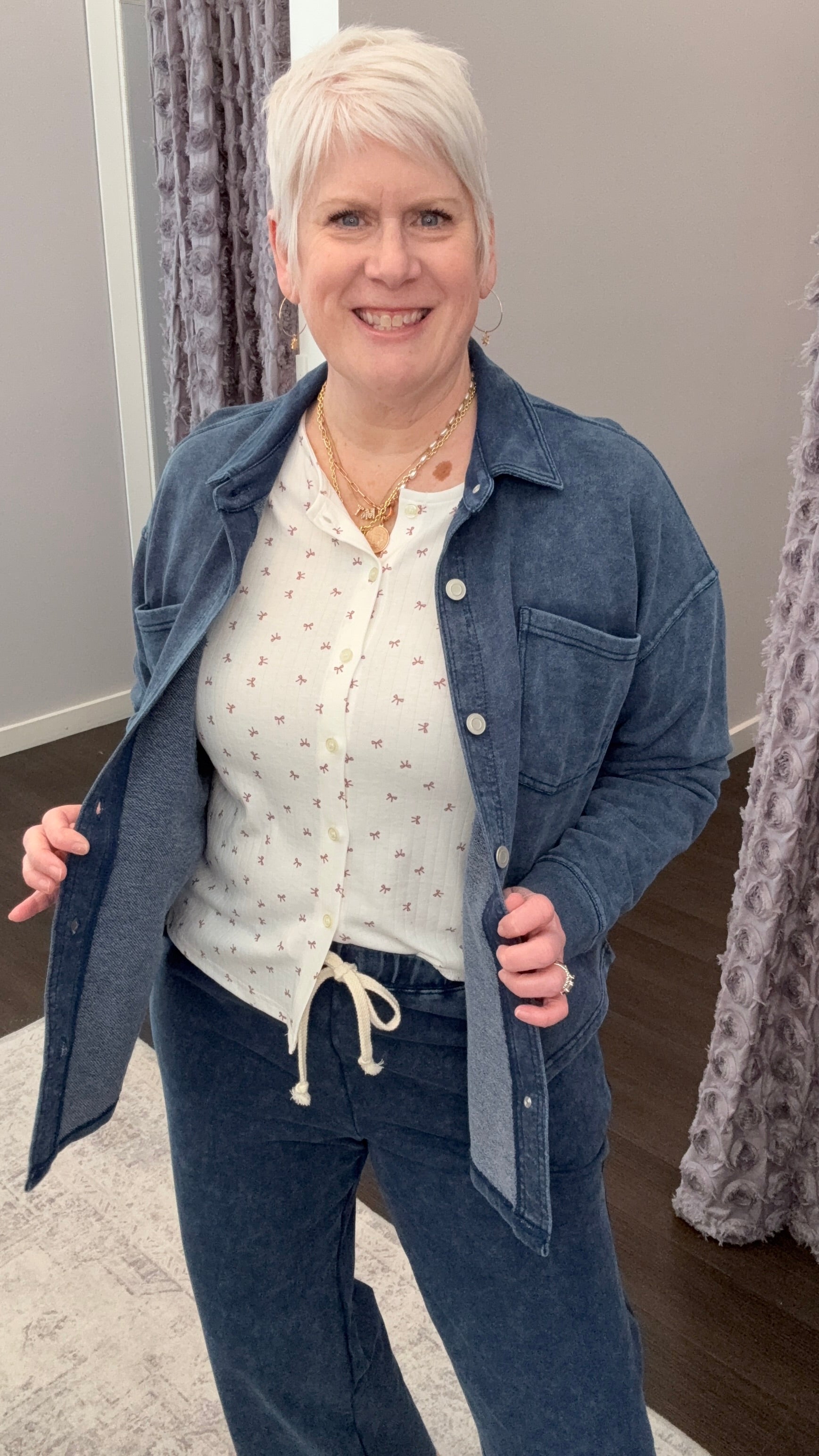 Wear it buttoned with leggings or denim, or toss it on open over a tee. Pairs perfectly with the matching washed indigo lounge pants for a cute set moment.