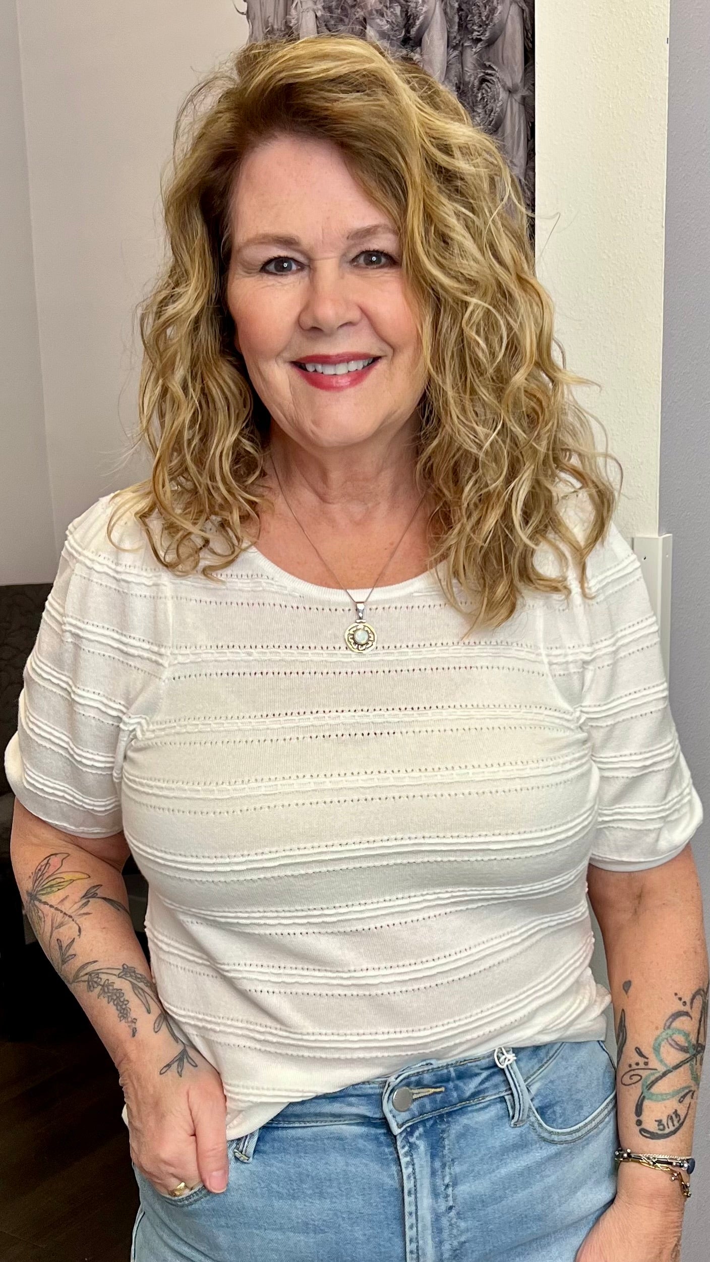 Meet your new “easy yes” top: a lightweight ivory knit with subtle textured stripe detailing that looks elevated without trying too hard. It’s breezy, soft, and instantly makes jeans feel a little more put-together.