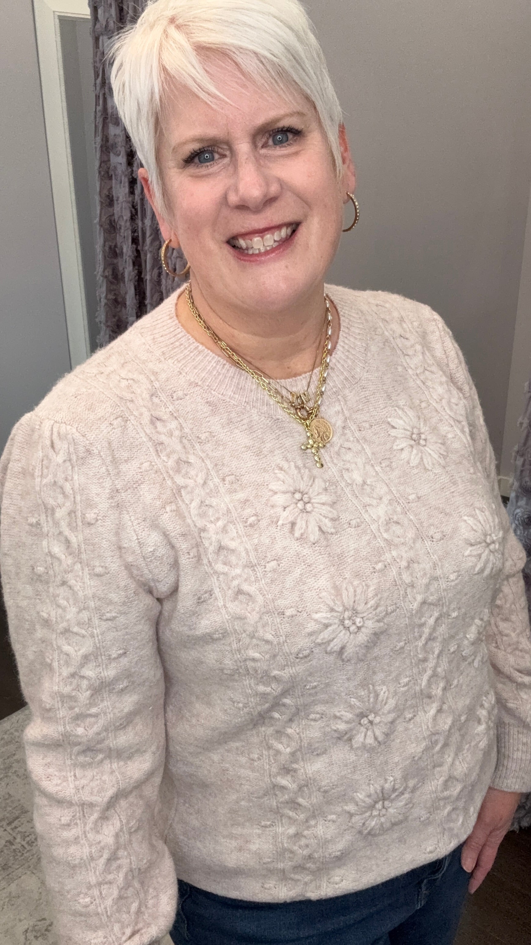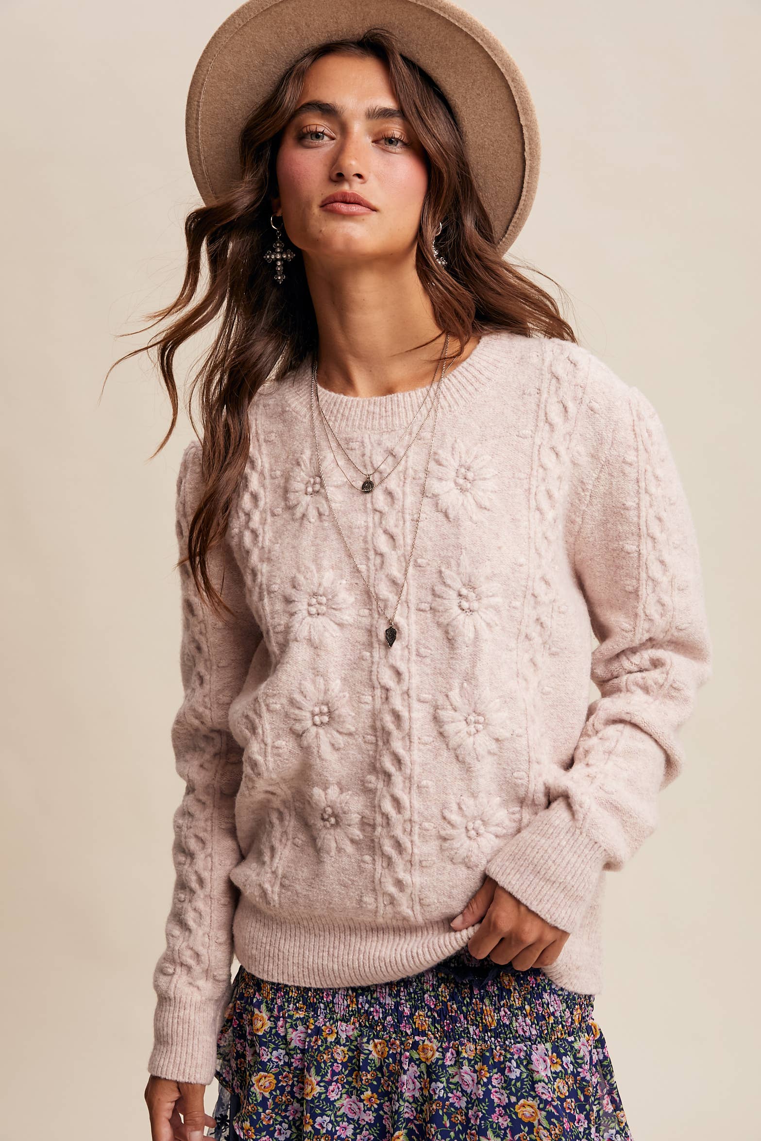 Wrap yourself in soft serenity with this darling knit! The Blush Bloom Sweater features a plush textured design with sweet floral details that add a feminine twist to your favorite cozy look. Its slightly slouchy fit and ribbed trim keep things effortlessly chic while you stay snug. Perfect with denim or a flowy skirt—add a wide-brim hat and a smile, and you’re the definition of fall charm.