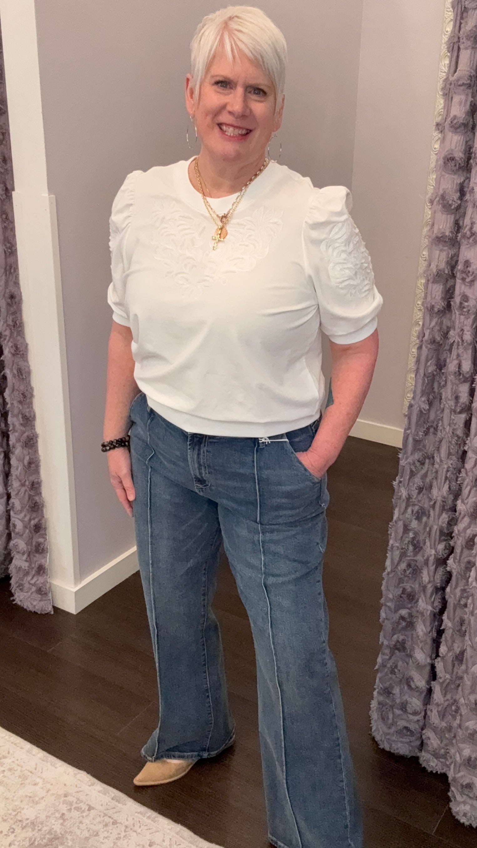 Say hello to the jean that quietly does the most. The Florence is a mid-rise, full-length flare with vertical seam detailing that creates a long, sleek line from hip to hem (aka: instant “legs for days” energy without trying too hard). The medium blue wash keeps it classic, while the tailored seams add just enough “boutique special” to make a basic tee look styled.