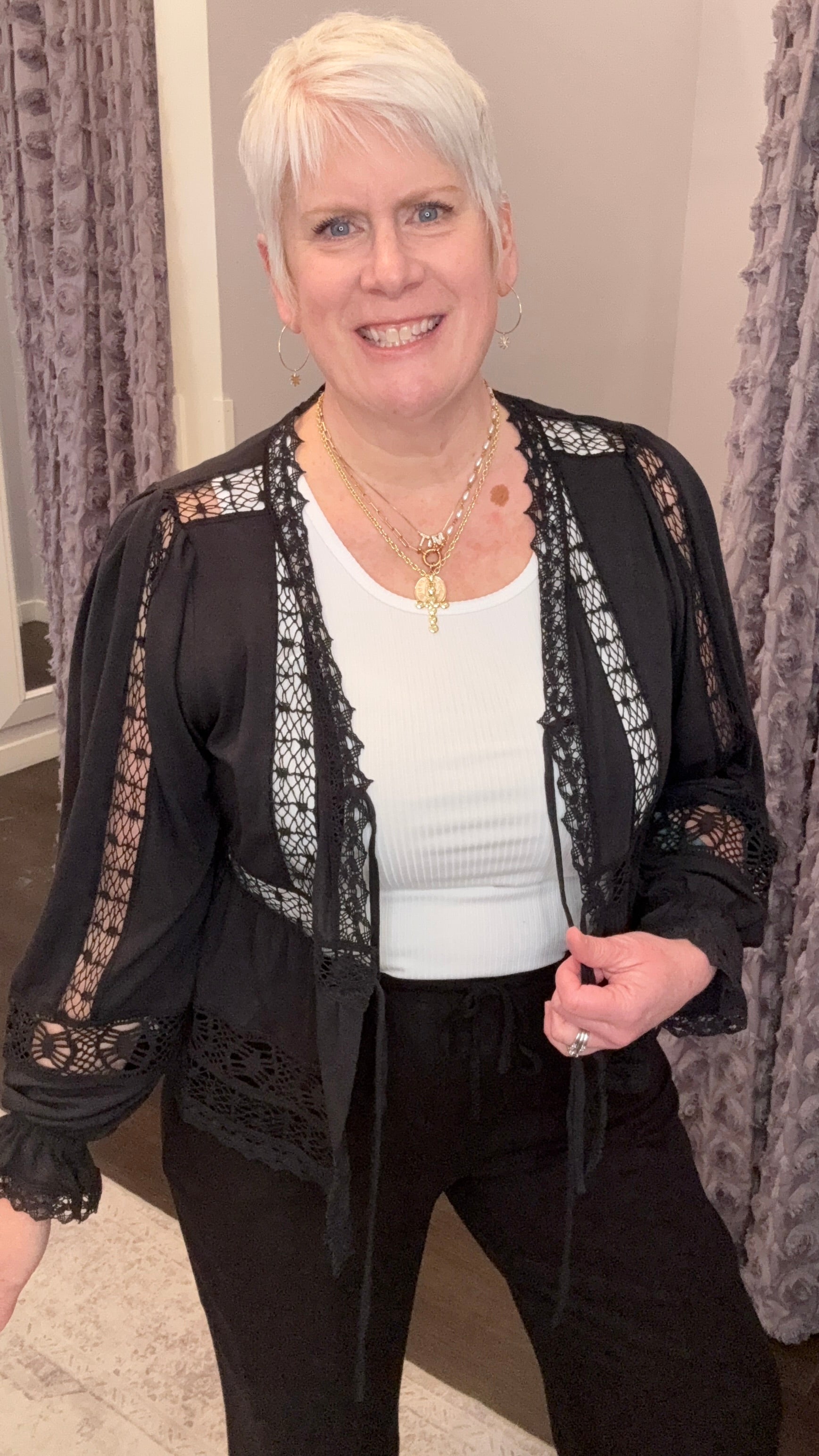 Romantic, lightweight, and just the right amount of daring—this black blouse is the statement piece your closet’s been waiting for. Designed with delicate lace insets throughout, a flattering tie-front neckline, and a softly cropped silhouette, it gives you that elevated “I didn’t try too hard” look.