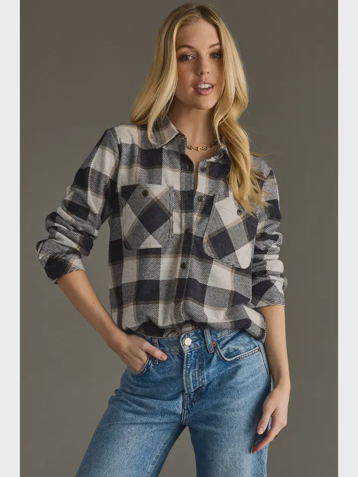 This navy, brown, and cream plaid button-up is the ultimate cool-weather cuddle buddy. With its super soft feel and relaxed fit, it’s perfect for sipping cider, strolling the pumpkin patch, or pretending you know how to start a bonfire. Style it open over a tee or buttoned up with denim for that effortlessly cute “I just threw this on” look (we won’t tell). Fall just called—it wants you to wear this.