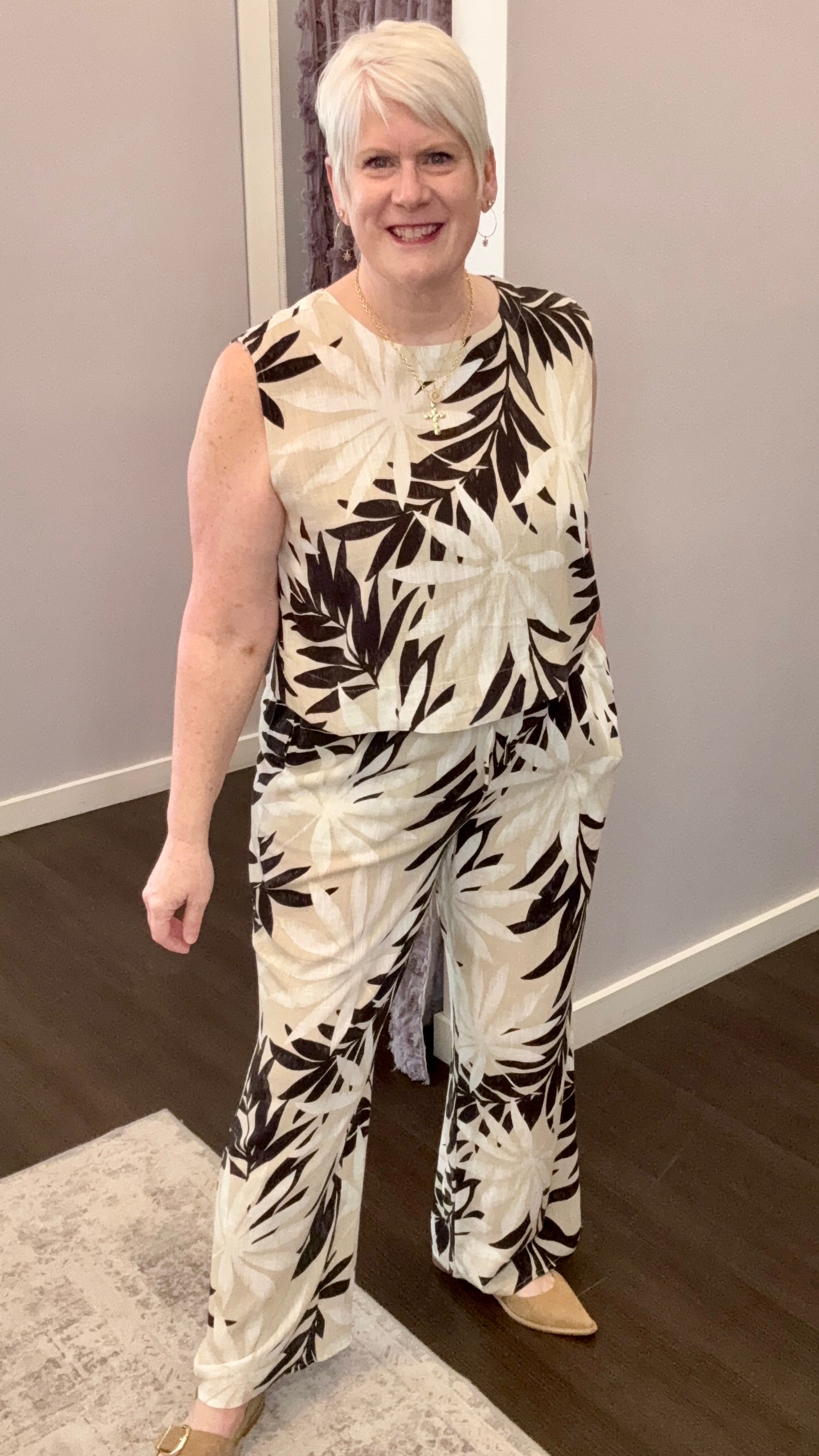 These wide leg pants bring together a soft, creamy neutral base with bold black palm detailing that instantly elevates your everyday look. The contrast is striking but still incredibly wearable—making these a standout without ever feeling overwhelming.