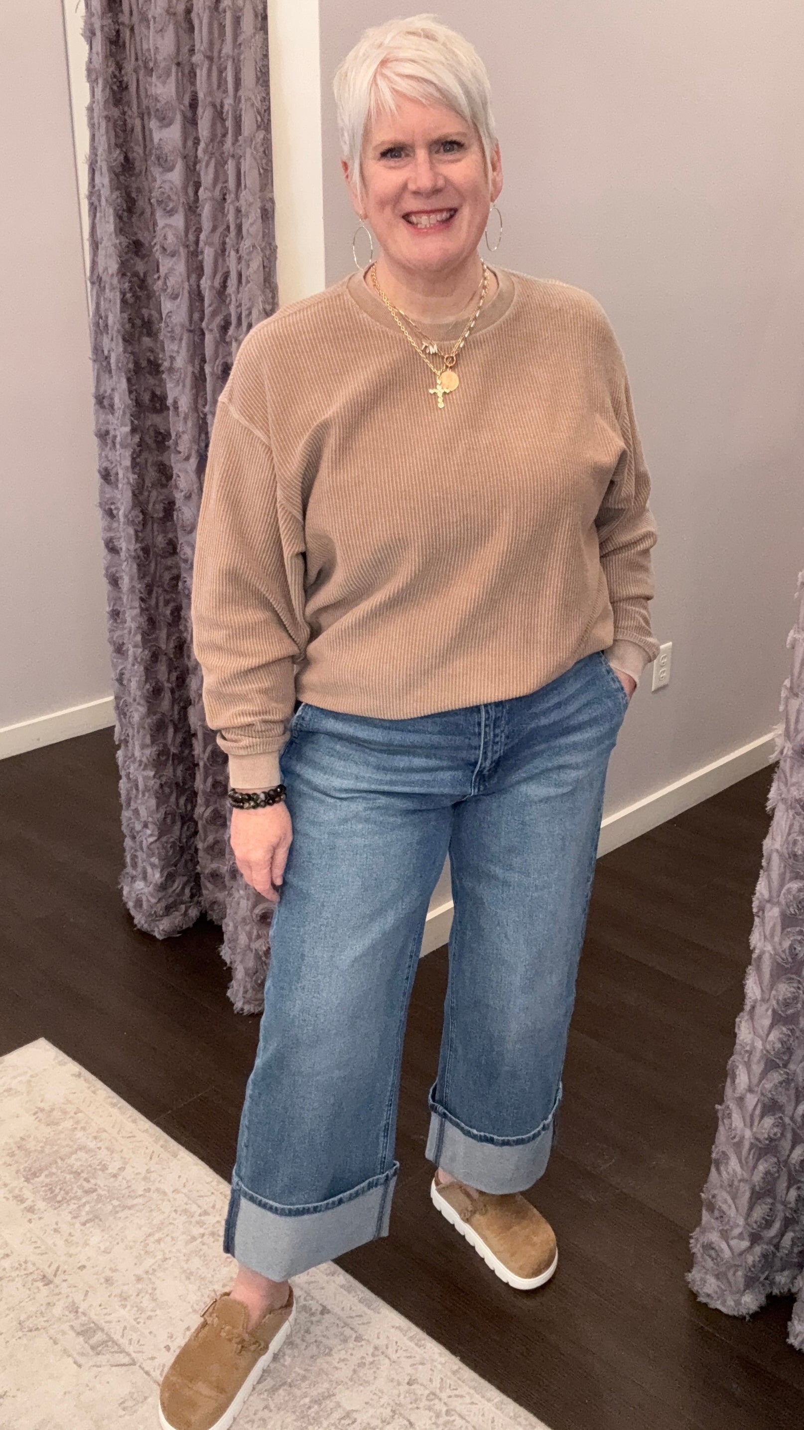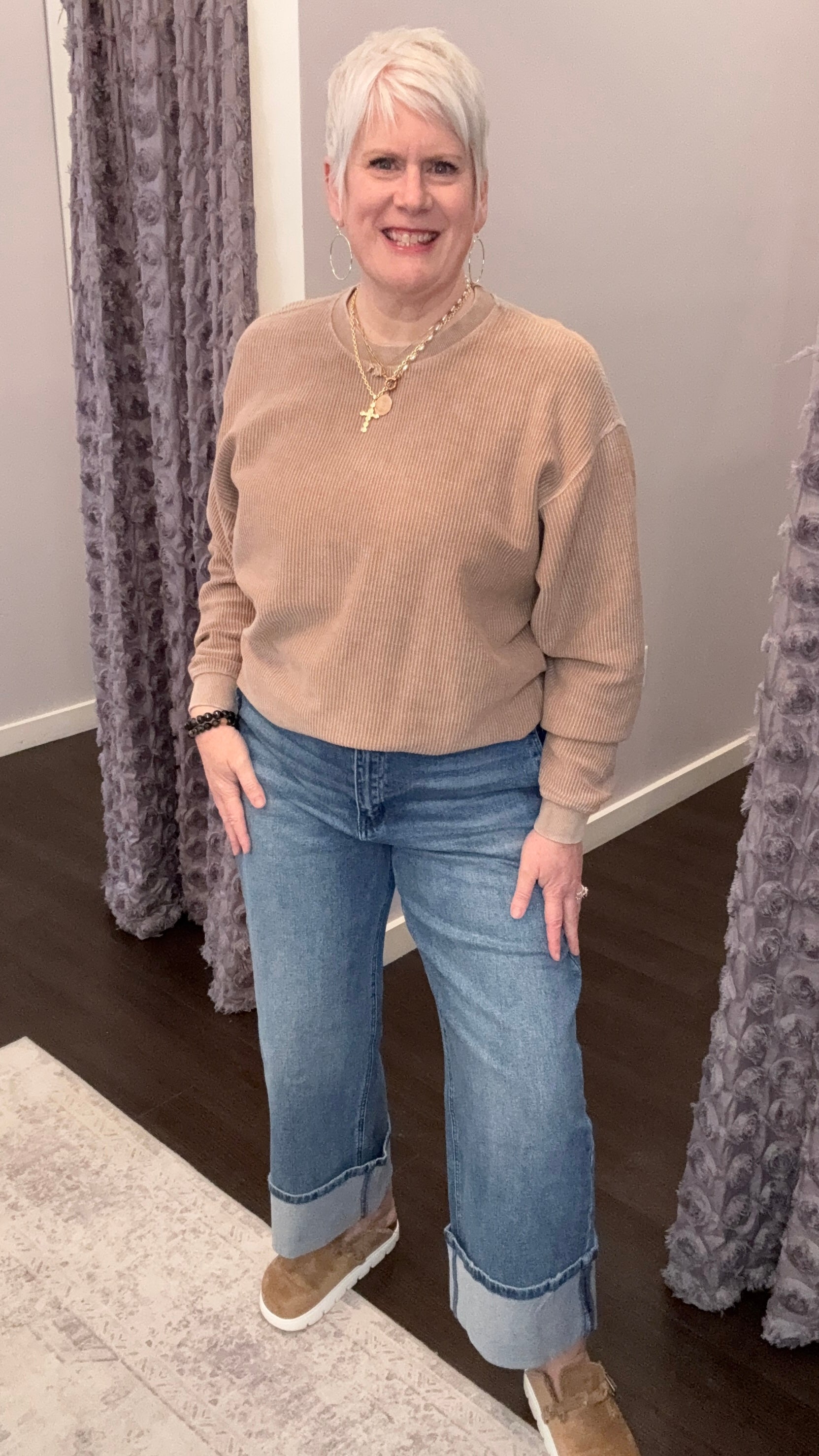 Meet the denim you’ll reach for on slow mornings, busy afternoons, and everything in between. The Slow Sunday Jeans feature a flattering high rise and a cropped wide leg that feels relaxed, modern, and just a little bit retro. The bold folded hem adds that extra boutique touch that makes even a simple tee look styled on purpose. Perfect for casual days, coffee dates, or dressing up with a cute blouse and sandals.