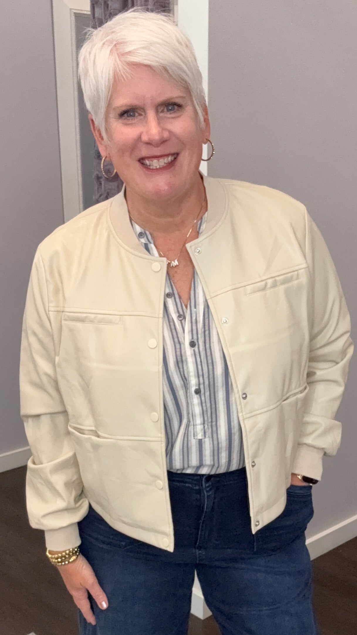 his cream faux leather jacket is giving all the luxe vibes without the fussy attitude. With its clean lines, snap buttons, and buttery-soft finish, it’s the perfect “throw on and go” layer that instantly upgrades any outfit.