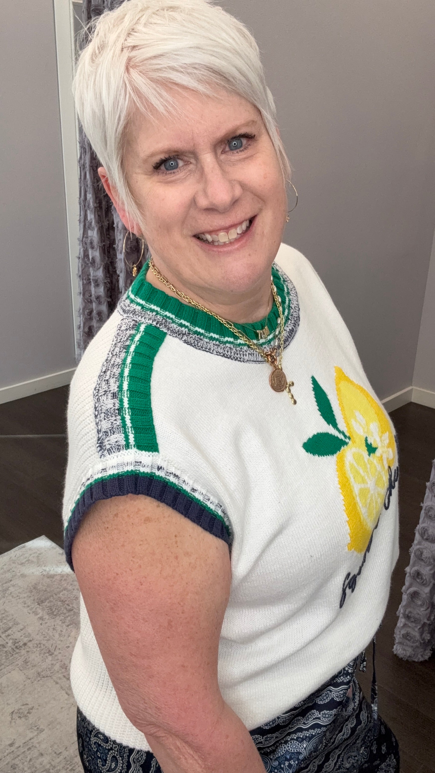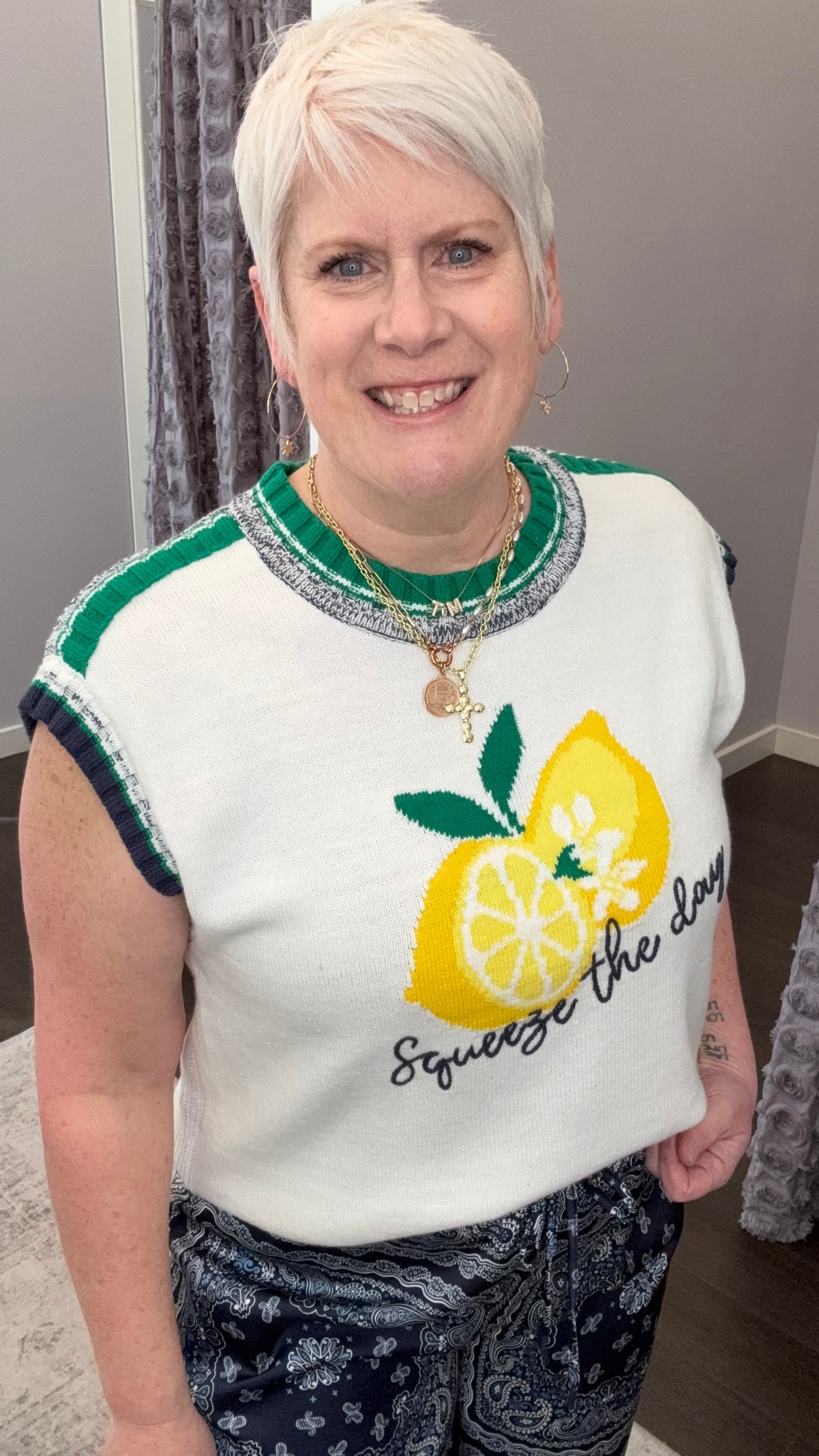 This cheerful knit vest is your instant mood boost with its bright lemon graphic and playful “Squeeze the day” script. The soft sweater knit, sporty contrast trim, and easy sleeveless fit make it a standout piece you can style now and wear into warmer days.
