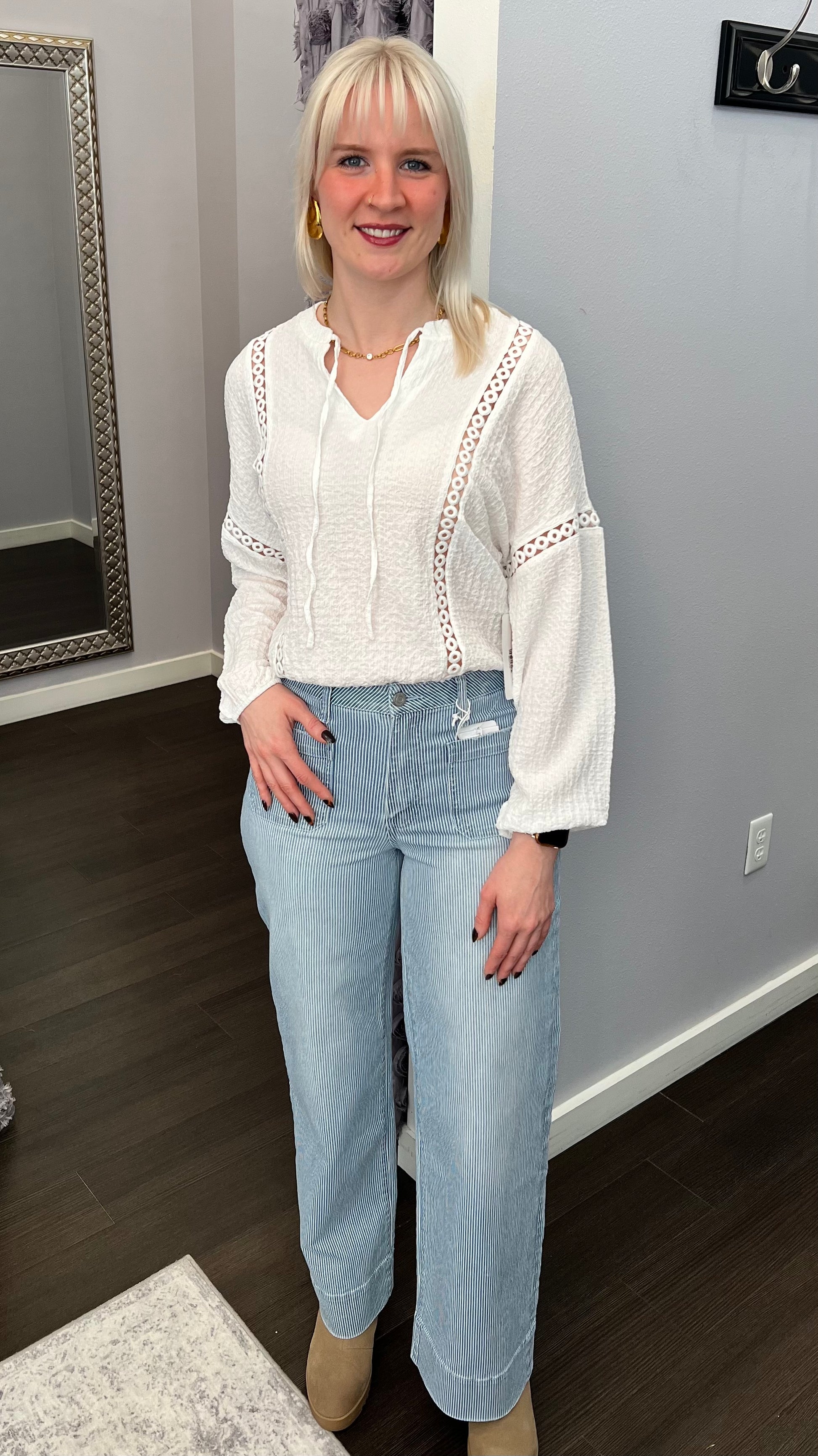These light blue + white pinstripe high-rise jeans are giving “classic with a little wink.” The vertical stripes keep the look long and lean, while the wide-leg cut brings that easy, breezy confidence (no stiff, squeeze-y nonsense). Finished with front patch pockets and a bold cuffed hem that basically says, “Yes, I planned this outfit… even if I didn’t.”