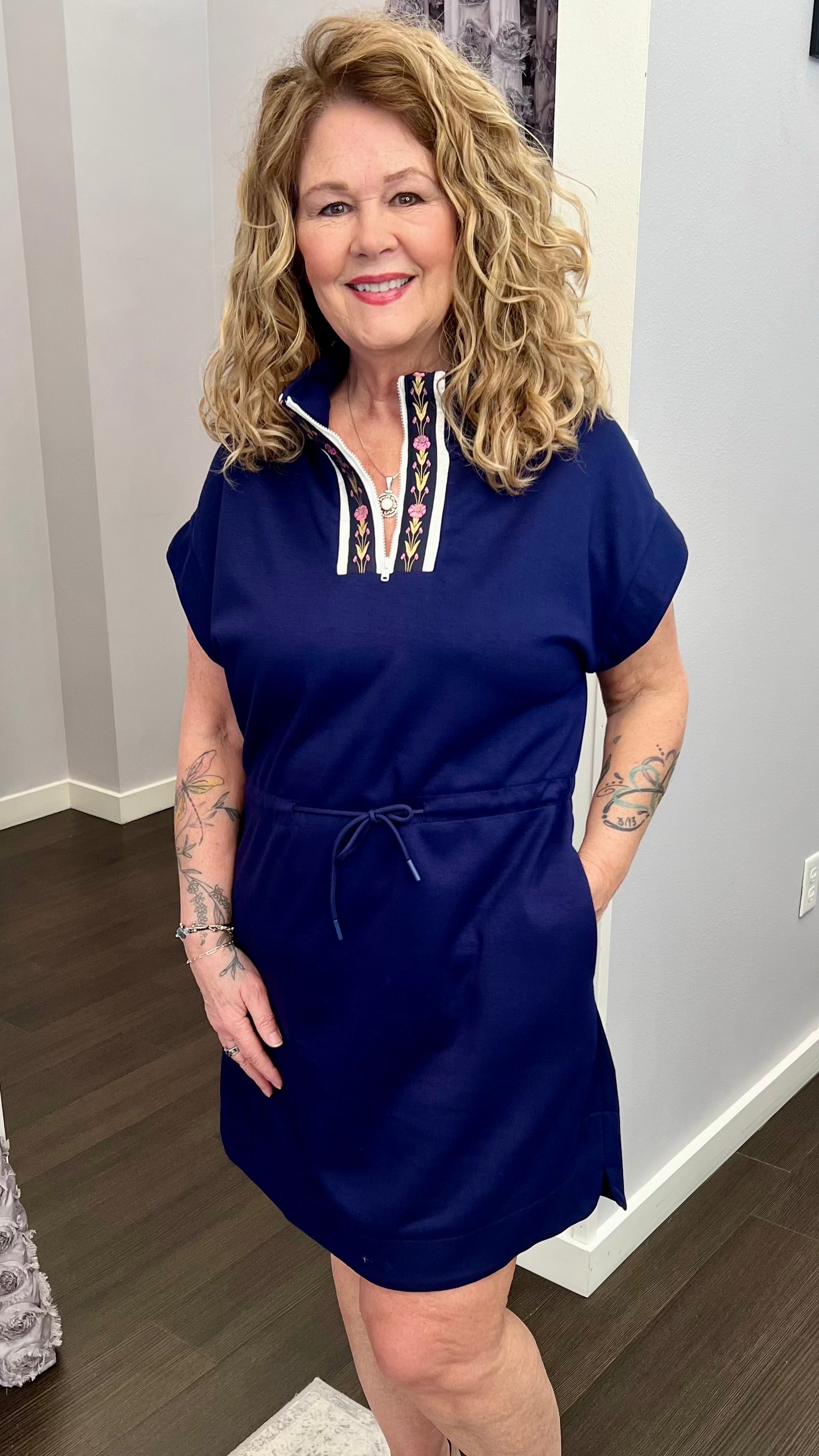 Easy, flattering, and ready for whatever the day brings, this lightweight woven dress is the perfect mix of polished and practical. The front zip neckline with embroidered trim adds a subtle pop of detail, while the adjustable drawstring waist lets you customize the fit. Finished with relaxed dolman sleeves, it’s a throw-on-and-go style that still feels put together.