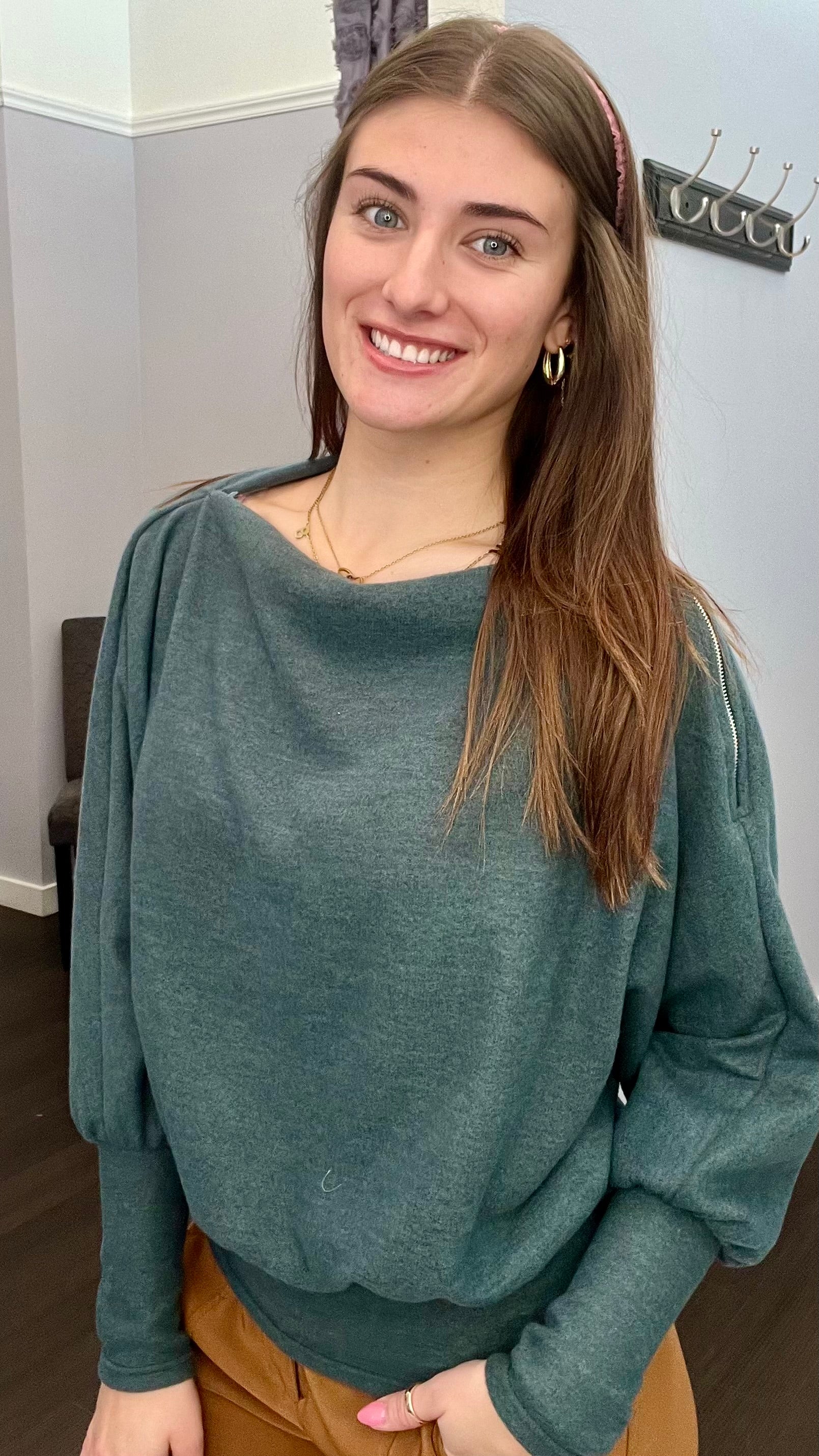 This soft knit beauty (95% Polyester, 5% Spandex) drapes effortlessly with its dolman sleeves and sleek shoulder zipper detail — because basic is so last season. The subtle stretch keeps you comfy, while the modern neckline gives that off-duty-chic vibe you didn’t know you needed.