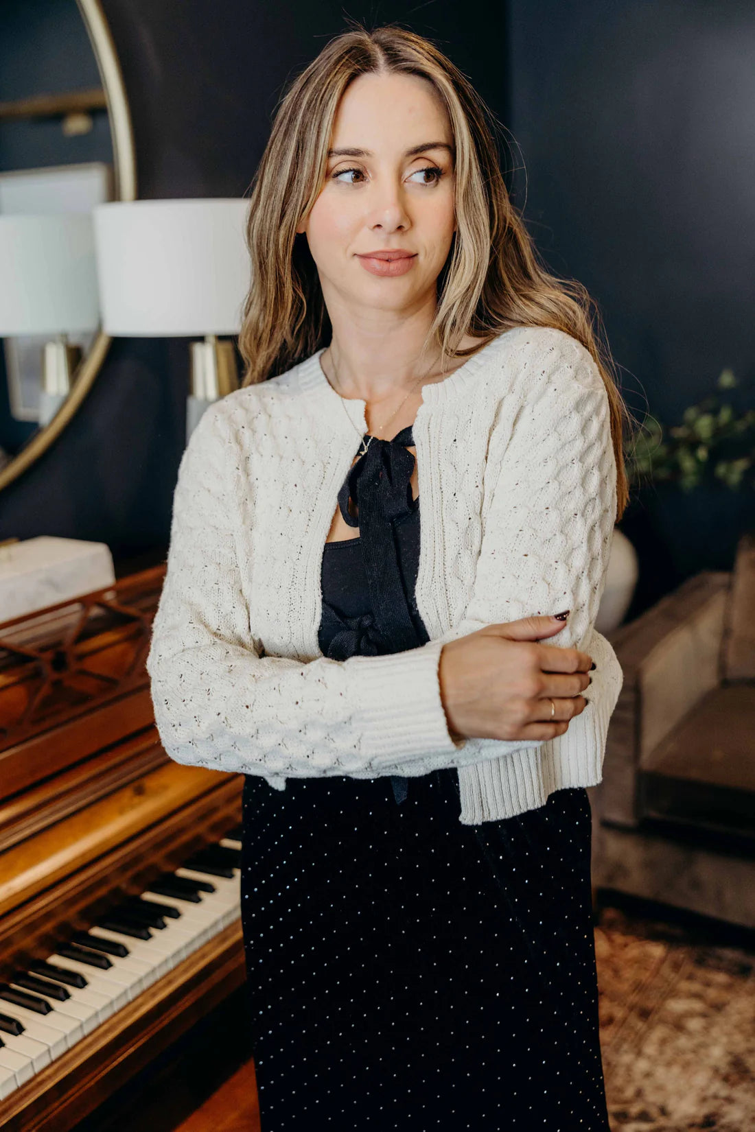 This cozy little number is the definition of sweet meets sophisticated. With its soft, bubble-textured knit and charming cropped silhouette, it’s your go-to for layering without losing shape or charm. The real showstopper? Those luxe velvet tie details that bring a touch of old-Hollywood romance to your everyday look.